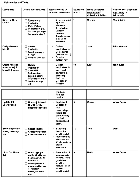 Our team started off creating a project plan to help establish a clear roadmap for how we'll approach the design project. This plan allowed us to stay organized and strict with working in a compressed timeline and allowed the team to become proficient at time-boxing the work.